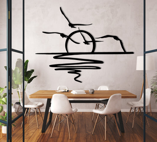 Imagine a stunning metal art piece capturing the ethereal beauty of a flock of birds in flight—a mesmerizing representation crafted from durable steel. This metal sculpture depicts a dynamic formation of birds in various stages of flight, their wings gracefully arched, evoking a sense of freedom and movement frozen in time.