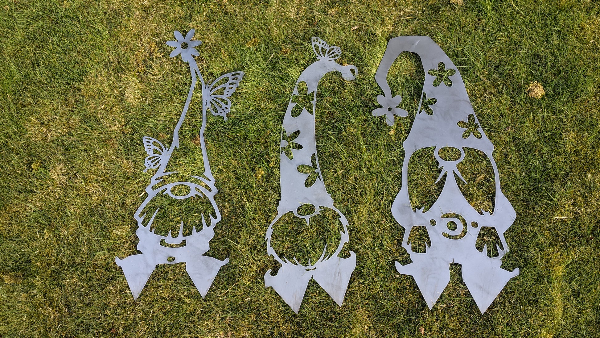 Yard gnomes use 16ga steel and come in 12" 18" 24". It is sturdy, but it will bend if pushed too hard, apply pressure by the feet to get it to stick firmly into the ground.